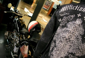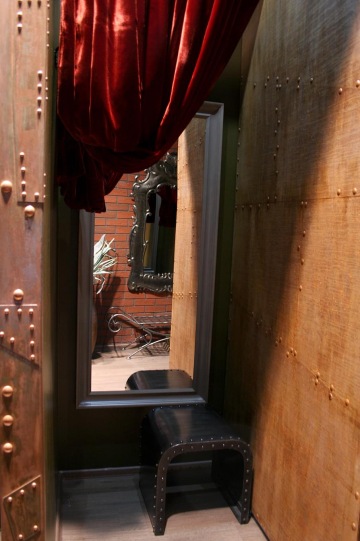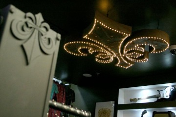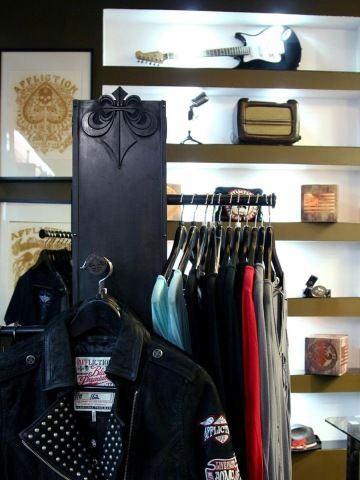 Strop zdobí masivní kovový lustr ve tvaru symbolu z loga Affliction - vyrobený na zakázku. Abychom dosáhly požadovaného charakteru osvětlení, použily jsme k jeho výrobě tři vánoční ledkové řetězy. Stejně tak zkušební kabinky byly vyrobeny pasíři na míru v industriálním stylu značky z plechových plátů s nýty, které opatřili rezavou patinou.