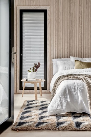 - Materiály: světlé dřevo, přírodní textilie a čalounění (vlna, ovčí kůže, len, juta, pytlovina)