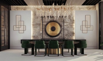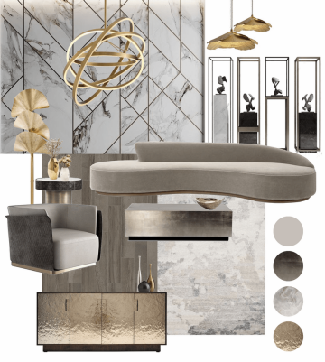 - Prvky: sochařská díla inspirovaná přírodou, pokojové rostliny, závěsná a výrazná svítidla