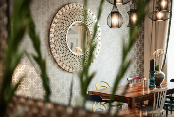 Ornament byl do bytu přenesen v podobě tapety, zamilovaly jsme si také úžasné kulaté zrcadlo z Donate, které vévodí hlavní stěně místnosti.