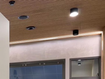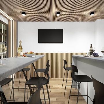 Pro útulnost a dobrou akustiku jsme na strop a část stěny navrhly akustické dýhované panely od českého výrobce Woodpasta. Lamelové obložení nám umožnilo skrýt nehezké radiátory a vedení trubek od topení. Vytvořily jsme sádrokartonové boxy, které se poté obložily akustickými panely. Část lamel je vyndávací tak, aby se mohly radiátory regulovat a teplo vychází mřížkami umístěnými na horní části těchto SDK boxů.