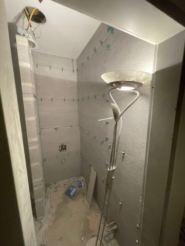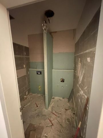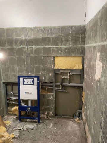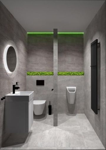 Kvůli nedostatku prostoru nebylo možné splachovací moduly WC a pisoáru zasekat do stěny, bylo nutné vytvořit přizdívku, kterou jsme, ale pak mohly využít k umístění další přírodní mechové dekorace a dodání dalšího zeleného prvku do prostor společné toalety.