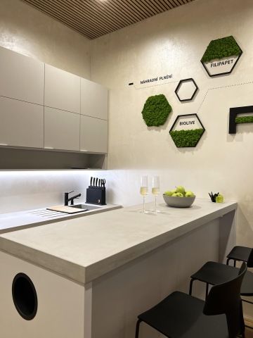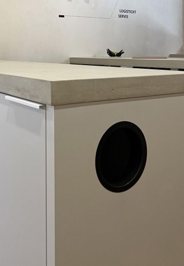 Betonové pulty na míru jsou od firmy Švec beton, každý pult váží cca 120 kg, jejich dokonalé kotvení (skryté výztuže) do zdí a podlahy bylo tedy zásadní. Do pultů jsme také nechaly vytvořit průchod pro umístění držáku na příbory a odkapové drážky u dřezu.