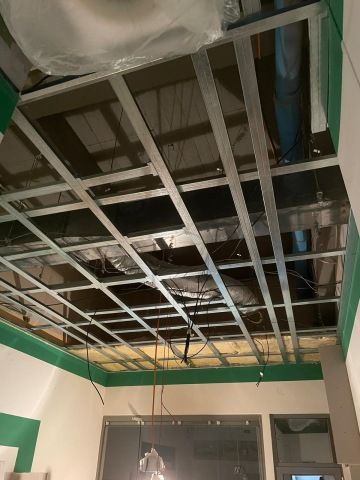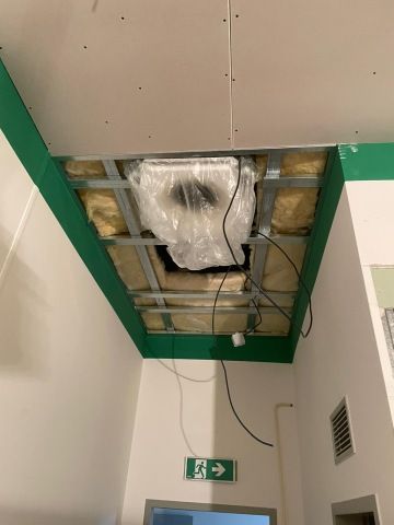 Domnívaly jsme se, že pro vytvoření nového stropu budeme muset snížit stávající výšku (3,2 m). Po odstranění minerálních podhledů se zjistilo, že samotný prostor je velmi vysoký, takže snížení nebude nutné a ještě se povede schovat klimatizační jednotku do stropu.