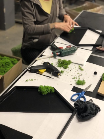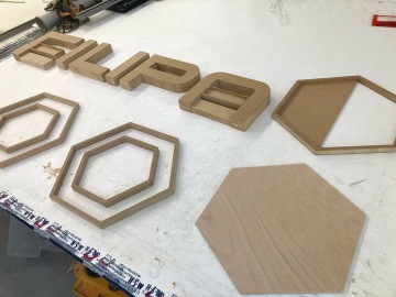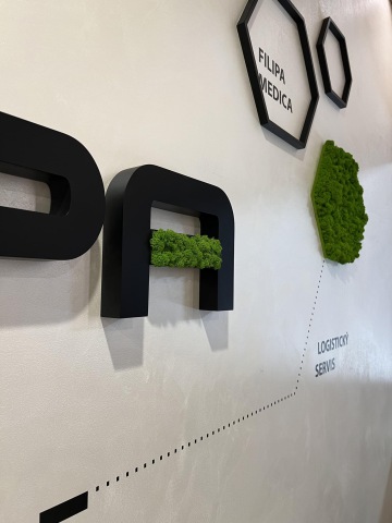 Produkce této stěny byla poměrně složitá, neboť je zde použito vícero technologií a materiálů. Písmena loga Filipa jsou frézované z 4 cm tlusté MDF desky, hexagony z 2 cm MDF desky, broušené a poté lakované matnou černou. Dvě z písmen mají profrézovanou vaničku, aby se do nich mohl vlepit mech. Jedná se o stabilizovaný přírodní mech, který zůstává v této formě při zajištění dostatečné vzdušné vlhkosti v prostoru, mezi cca 40-60 %. Mech se lepí ručně po jednotlivých kouscích.
