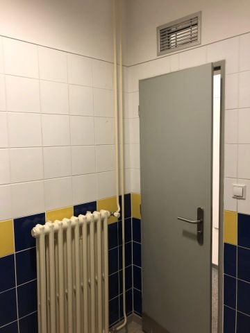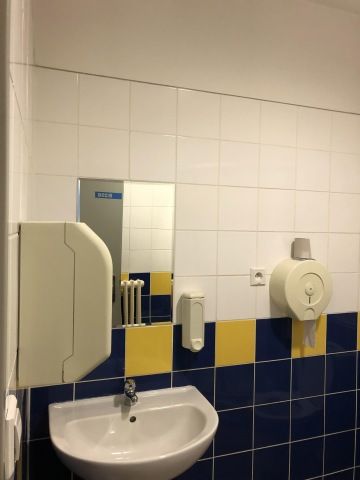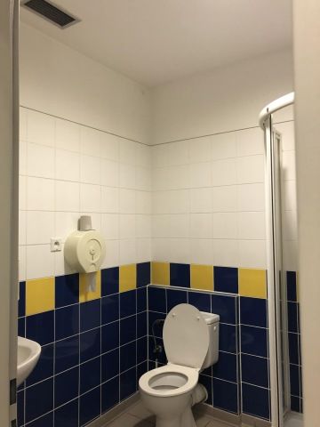 V původní koupelně jsme kvůli rozvodům vody zachovaly stejnou dispozici tj. umyvadlo i WC na stejném místě. Ze sprchového koutu jsme vytvořily pisoár. Společné WC v šedých barvách, kde je krásným dekorem použití 3D dlažby na některých stěnách toalety. Jelikož je při akcích ve skyboxu celkem velká fluktuace lidí, při vstupu na WC není třeba nikde hledat vypínač, pohybovým čidlem se zapne bílý LED pásek za zrcadlem a zelené LED pásky na stropě.