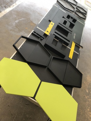 Poslední technologií byly fólie vyřezáné na ploteru (texty, čáry) a následná instalace celé dekorace za pomoci šablon vyřezaných na plotru a laseru, aby se docílilo naprosto přesného umístění všech prvků na zdi.