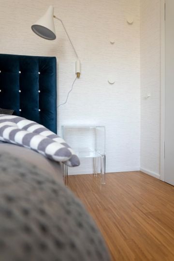 Velkou sametovou postel se Swarovského křišťály jsme dovezly z Itálie. V boxu pod matrací je další úložný prostor na lůžkoviny či jiné větší věci. Matrace se dá pohodlně zdvihnout spolu s roštem. Subtilního vzhledu jsme dosáhly též použitím průhledným materiálů - lampička na psacím stole a noční stolek z průhledného polykarbonátu jsou od značky Kartell.
