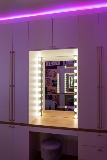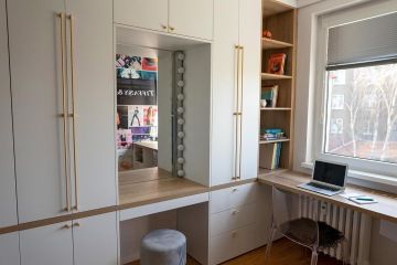 Pokoj není příliš velký, proto jsme zvolily výrobu skříně na míru s integrovanou toaletkou a psací stůl, který vychází přímo ze skříně, vzniká tak jedna velká nábytková sestava (s krásnými zlatými úchatkami od Viefe). Do niky pro toaletku jsme zabudovaly osvětlení připomínající retro šatnu hollywodských hvězd a velké nástěnné zrcadlo umístily přesně naproti, takže je možné se zrcadlit donekonečna.