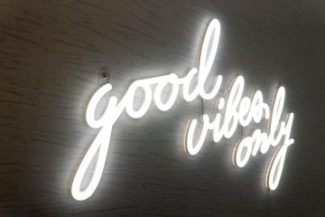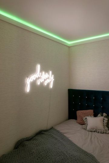 "Good vibes only" světelný nápis nám dal trošičku zabrat, ale nakonec jsme ho sehnaly. Zde jsme si zvolily čistě jen bílé denní světlo, nicméně všechny tyto LED nápisy je opět možno libovolně nakombinovat co se barev týče. Jako podklad jsme daly bílou tepetu s jemnou texturou, která vynikne právě při rozsvícení, ale jinak není příliš výrazná.