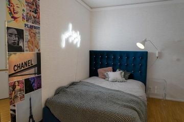 Vzhled pokoje pro teenage slečnu, které jsme již pokojíček dělaly, ale to jí tehdy bylo osm let. Dnes už tedy růžovo černý koncept a palanda, které si tenkrát tolik přála nebyly vyhovující. Nyní byla zadáním móda, tapeta z obálek módních časopisů, LED podsvícení, velká postel a toaletka, úložné prostory na oblečení a prostor na učení.
