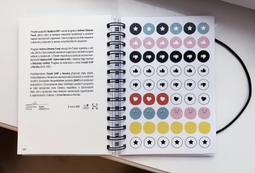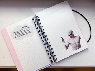 Zápisník je barevně rozdělen na 4 části a prokládán grafikou, která působí jako vystřihovaná koláž nebo ruční kresby. Poslední dvoustrana obsahuje tématické samolepky se smajlíky a dalšími ikonkami, které se hodí pro další použití na stránách zápisníku.