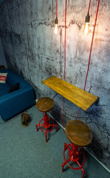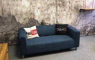Zároveň zde samozřejmě bylo potřeba zázemí poskytující vše co pro práci potřebuje - velký stůl na veškerou techniku... Sedačku, kde se točí rozhovory a herní recenze, to vše umístit před zajímavé pozadí, které bude dobře vypadat v záběrech.