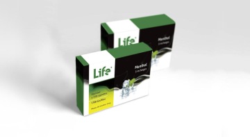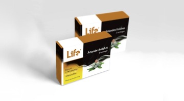 Logo a obal produktů pro novou francouzskou značku elektronických cigaret. Design boxu startovací sady - box s bílým 3D vzorem a černými stranami. Design obalu 11 příchutí - náplní cigaret, každý obal má jiné barevné schéma, logo LIFE mění barvu v závislosti na barevnosti obalu.