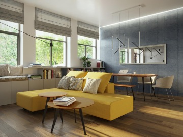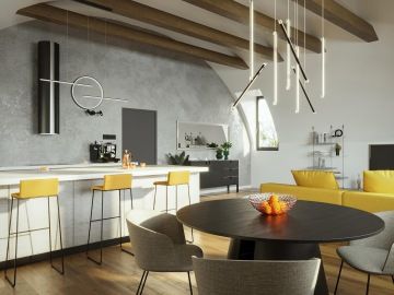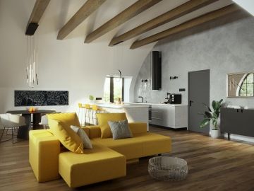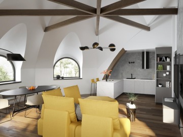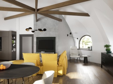Tento byt je umístěn v části střechy s kopulí. V tomto mnohoúhelníku vznikl zajímavý obytný prostor s vysokým stropem a přiznanou střešní konstrukcí s kuchyní, jídelnou, obývacím prostorem a čtecím koutkem. Atypický tvar místnosti si žádá i atypickou sedačku - zvolily jsme tedy modulární sestavu Archipelago Matacao a k ní průhledné stolky od Kartell