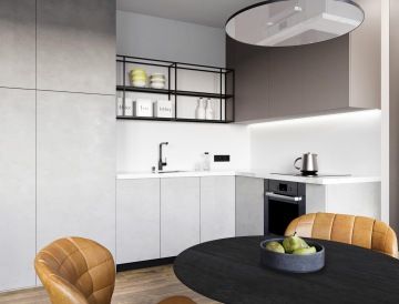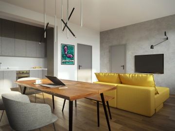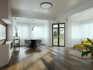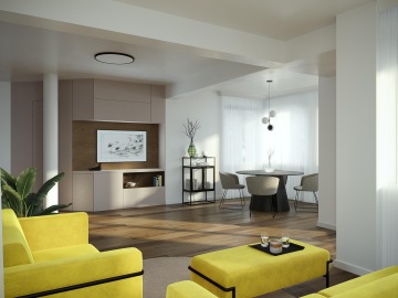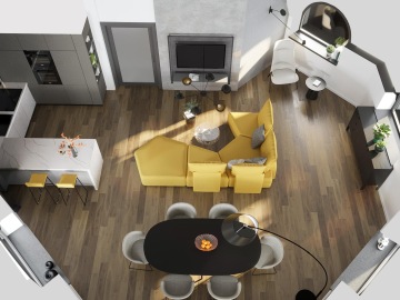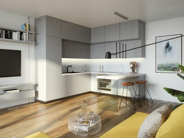 Byt se třemi balkony má tvar "L" v jehož špičce je prosvětlený atypický obývací pokoj s jídelní a kuchyňskou zónou. Kuchyňská část s linkou ve tvaru “U” (LUBE Cucine) vznikla v jednom ze 2 výklenků tohoto prostorného pokoje.