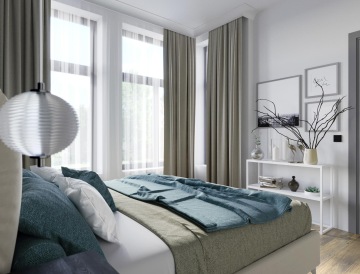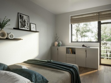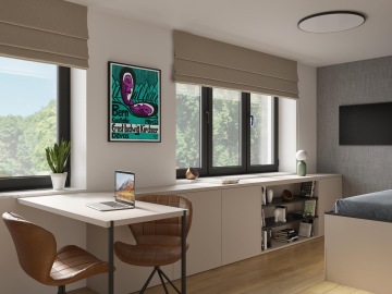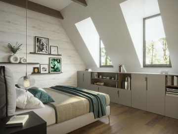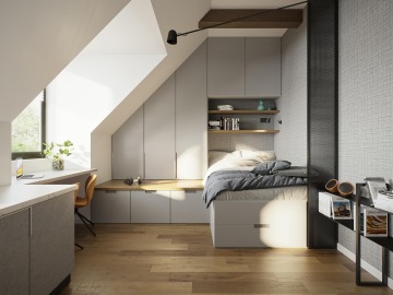 I zde je kromě 2 židlí je veškerý nábytek vytvořen prostoru na míru. Zvýšená postel s úložnými prostory přechází v mělkou šatní skříň a od pokoje je lehce zastíněna kovovým perforovaným panelem. Kolem postele je po celé délce čalouněný opěrák, aby bylo možné postel používat i jako pohodlné místo pro sledovaní televize, která je na otočném držáku na zdi. Z nábytkové sestavy u okna a vychází také pracovní zároveň jídelní část se dvěmi otočnými čalouněnými židlemi Zuiver.