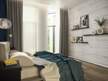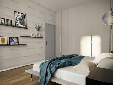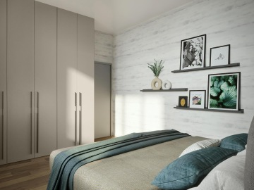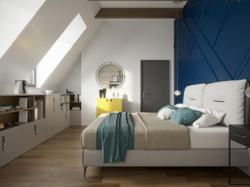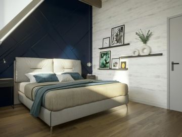 Ložnice je jako ve většině bytů v domě s krásnou postelí Scotty italské značky Felis před výraznou tmavě modrou "3D" stěnou s lištami, které tvoří geometrický motiv přes celou zeď. Závěsná svítidla nad nočními stolky jsou od italské značky Lodes. Ve snížené části místnosti je nábytek zhotovený na míru, který poskytuje další úložné prostory.