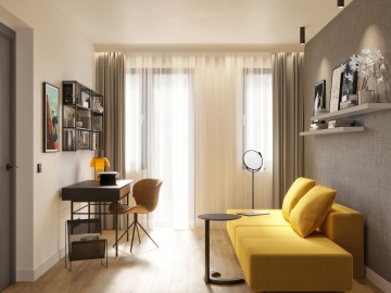 Jako jediný v domě, má tento byt ještě další pokoj navíc, který slouží jako pracovna a zároveň místnost pro hosty. Díky modulárnímu sofa Bonbon se zde pohodlně vyspí 2 lidé. Vznikla zde také hluboká walk-in šatní skříň s vnitřním LED osvětlením po celé délce stěny pokoje.