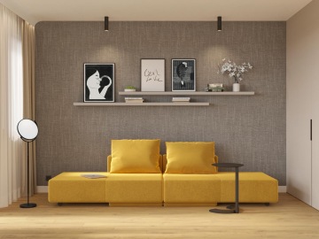 Menší sedačka Bonbon od Feydom se stahovatelnými potahy, která přestože nezabírá velkou plochu umožní taktéž přespání pro návštěvu. Také policovou sestavu kolem televize jsme navrhly, tak aby opticky příliš nezatěžovala prostor. Stěna je ukotvena na zeď a díky lankům a některým policím, které jsou z průhledného plexiskla opět působí vzdušně a subtilně.