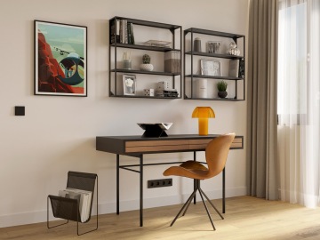 Pracovní zároveň jídelní část je umístěna pod oknem v prodloužení kuchyňské linky, s otočnými čalouněnými židlemi Zuiver. Nástěnná lampa Luceplan Counterbalance díky pohyblivému ramenu osvítí jakoukoliv část v bytě. Televizi je umístěna na otočném držáku vedle vstupních dveří.
