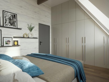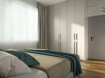 Tento byt je nejmenším na patře, přesto díky vysokému stropu působí realitivně prostorně. Kromě 2 židlí je veškerý nábytek vytvořen prostoru na míru. Zvýšená postel s úložnými prostory přechází ve skříň s integrovanými poličkami a sezením na šuplících v její spodní části.