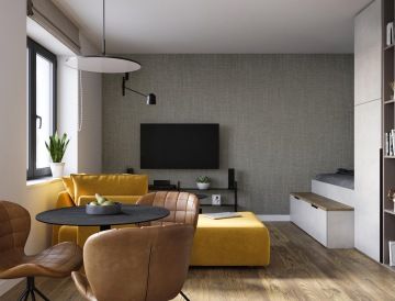 Tento byt má v obývacím pokoji atypicky řešená okna kvůli schodišti, které vede zvenku podél domu do suterénu. Použitím vestavného nábytku na míru s vyvýšenou policí na knihy jsme u nejnižšího okna vytvořily plochu na sezení a celá sestava tak opticky potlačila rozdíly výšky kasádovitých oken. Dominantní je žlutá sedačka Feydom Bonbon před LED nasvícenou tapetovanou stěnou od značky Romo.