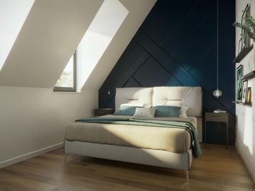 Ložnice má střešní okna s výhledem do zeleně a v čele výraznou tmavě modrou "3D" stěnu s lištami, které tvoří geometrický motiv přes celou zeď a dělají tak kontrast světlé posteli Scotty italské značky Felis. Nad nočními stolky jsou skleněná závěsná svítidla Lodes.