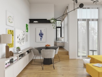 Místnosti mají malou metráž, ale vysoké stropy a velká francouzská okna interiér pocitově zvětšují. V obývacím pokoji je před velkými okny výrazná sedačka Bonbon, vedle níž jsou dveře na soukromou terasu. Další optická pomůcka je velké zrcadlo, které odráží světlo a venkovní terasu a prosvěcuje tak celý prostor. Vybraly jsme 1,2 m široké stropní svítidlo Grok Invisible s pohyblivými rameny a natáčecími bodovými světly, aby se tak mohl osvítit jídelní stůl, ale i zbytek malého obývacího pokoje. Obrazová stěna vedle jídelního stolu mezi sebou skrývá TV Frame od Samsung, který vypnutý vypadá jako další obraz a krásně tak splyne v prostoru na rozdíl od klasických plastových obrazovek.