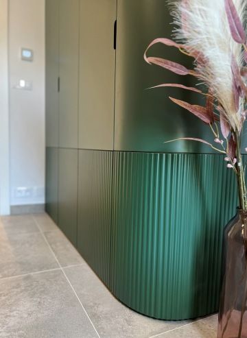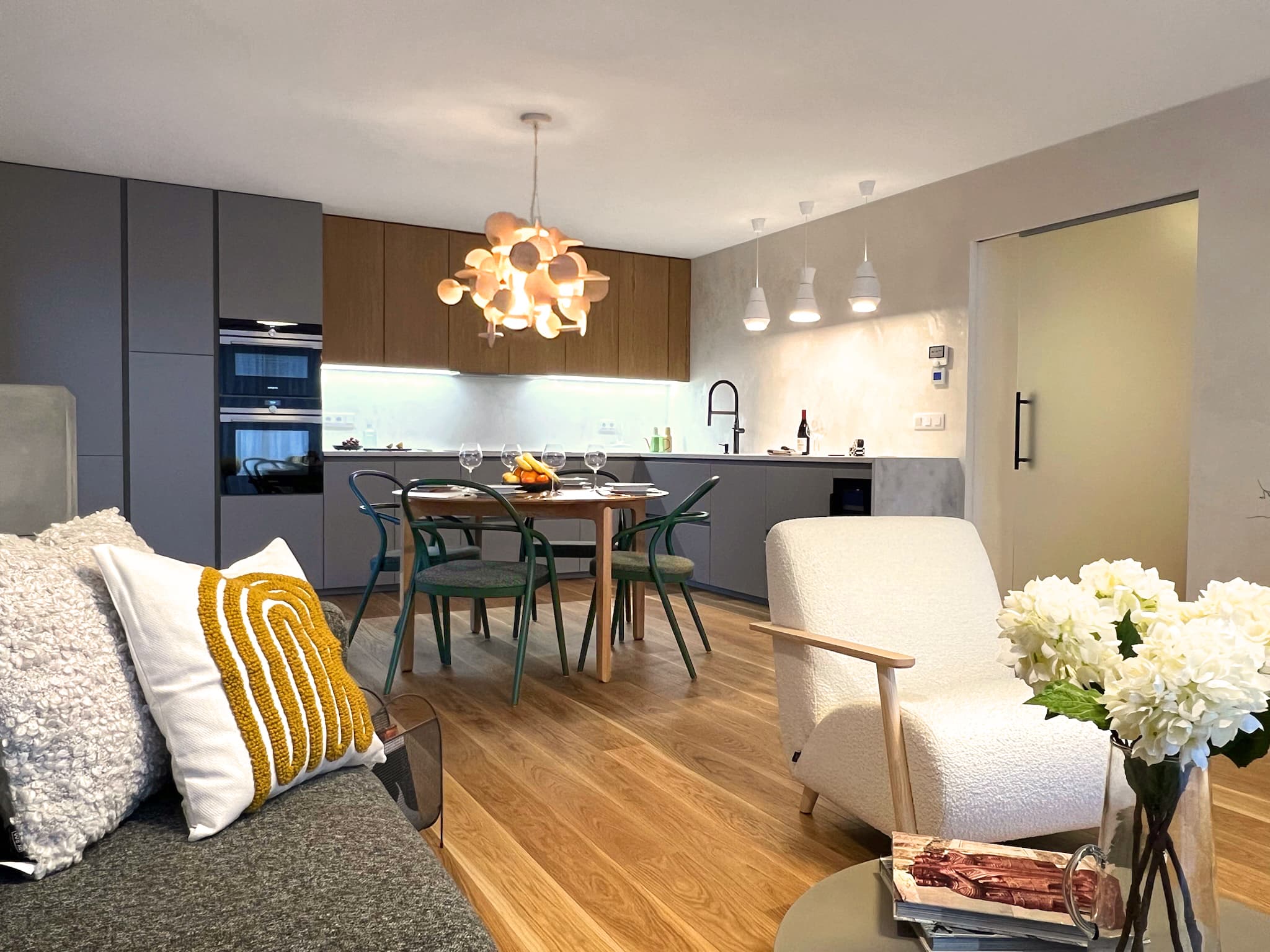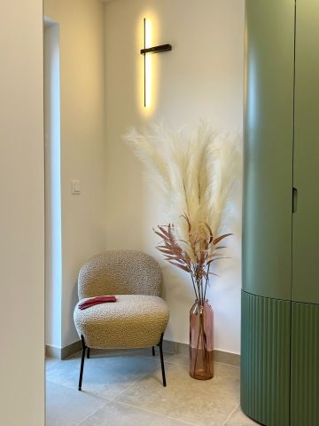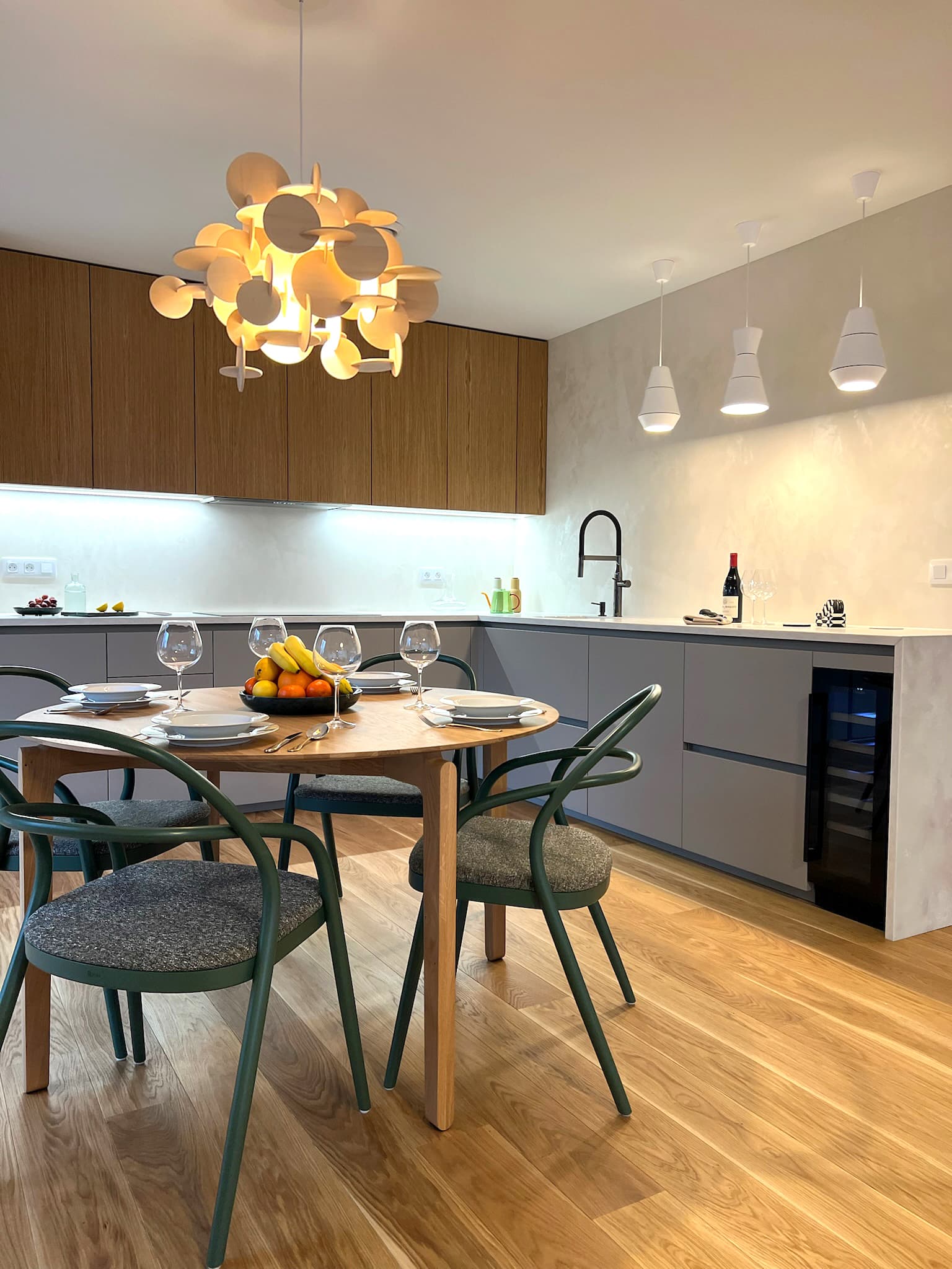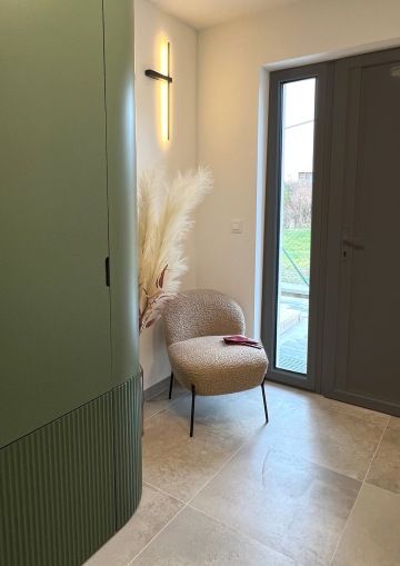 integrovaným barem a elegantními židlemi od italského designéra Giacoma Moore které podtrhují sofistikovaný vzhled. Splnily jsme přání klientů po moderní kuchyni, která nebude působit příkře a stroze – bezúchytková světle zelená lakovaná linka s dohmatovými lištami ladí se světlými vlnitými dvířky, kulatou digestoří a stylovými světly od španělské značky Estiluz . Celek působí jemně, útulně a harmonicky.
