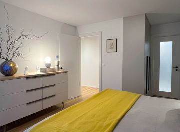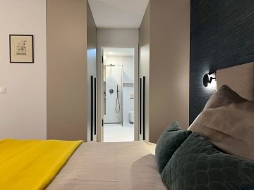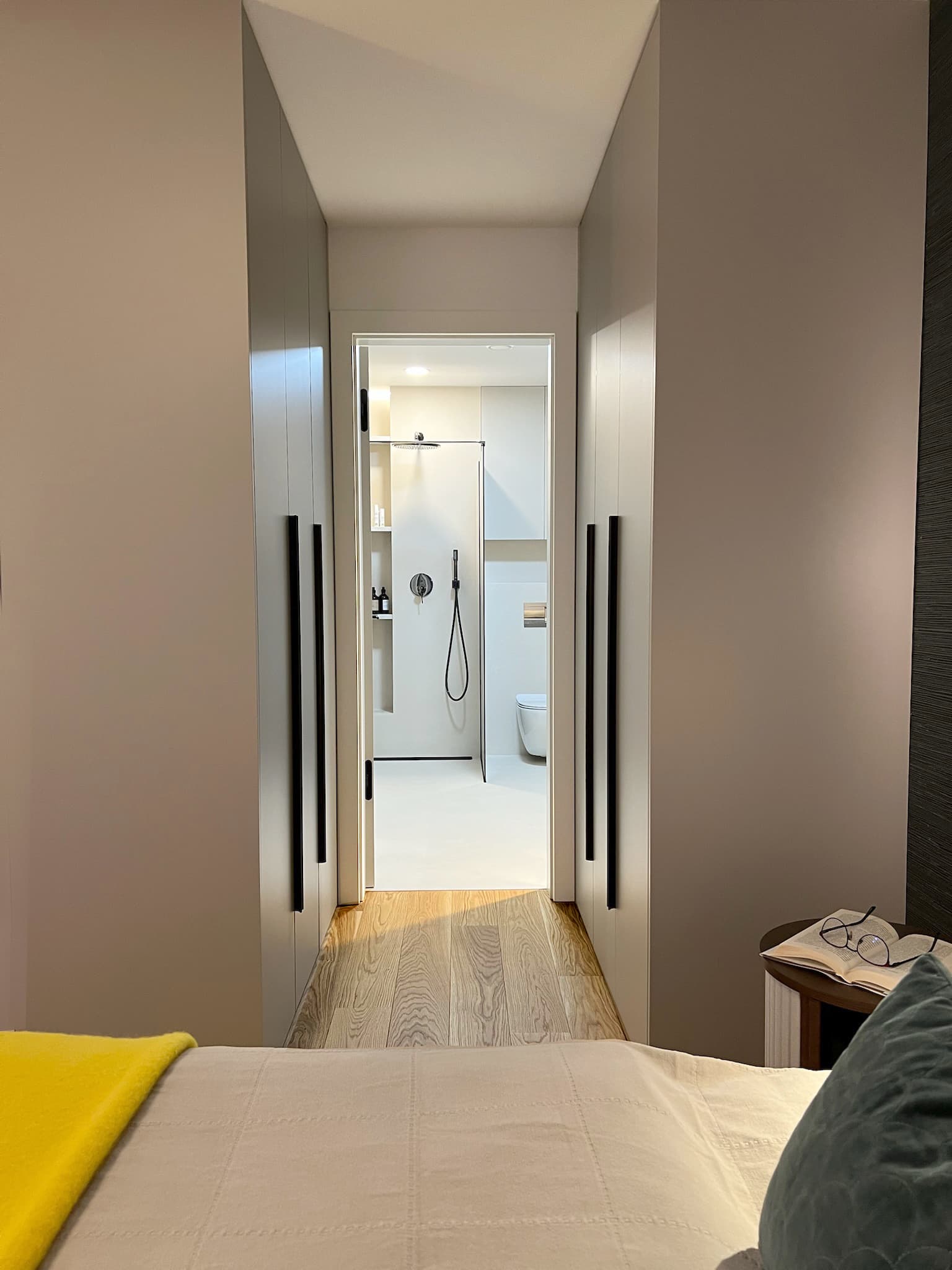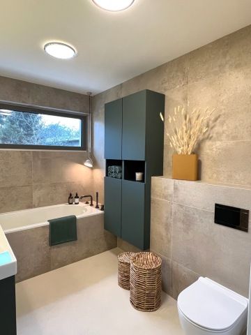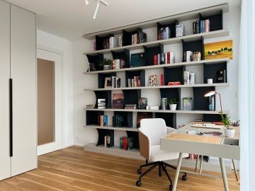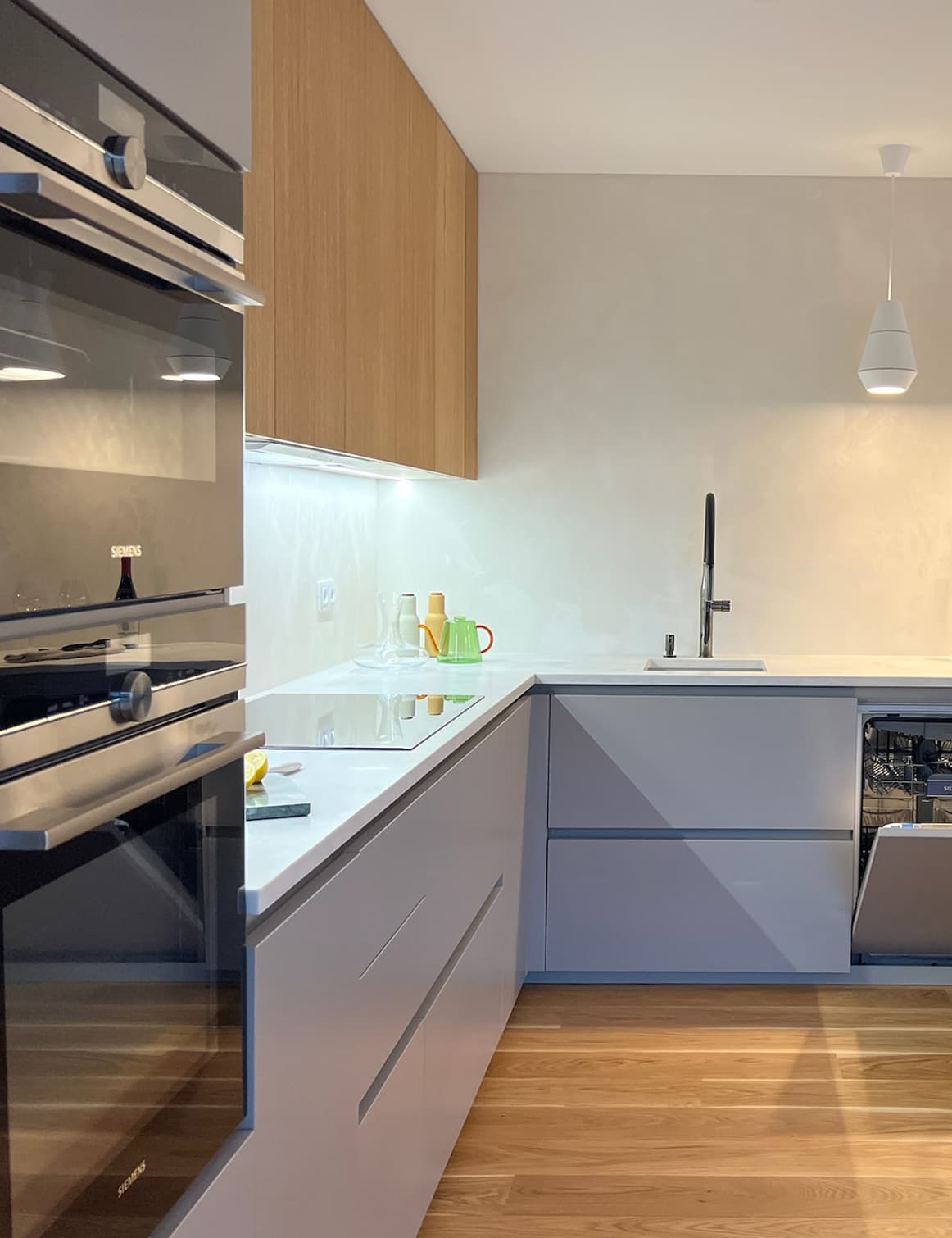 Vzhledem k vášni klientů pro vaření jsme vsadily na špičkové spotřebiče Siemens – dvě trouby (klasickou horkovzdušnou a parní), 80 cm širokou varnou desku a prostornou vestavnou lednici. Výsledkem je kuchyň, která kombinuje špičkový design s maximální funkčností, dokonale přizpůsobená potřebám této moderní domácnosti.