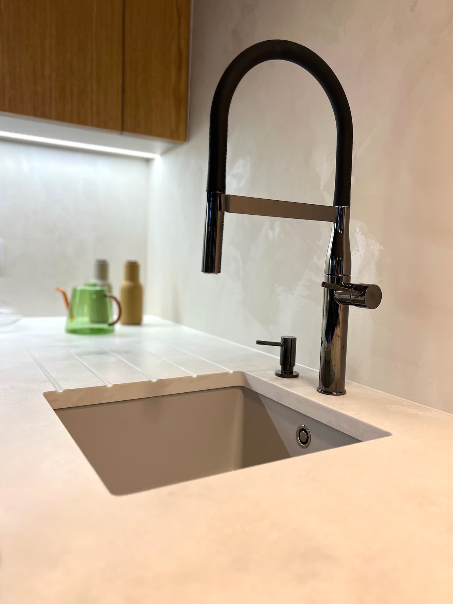 V případě kamenné pracovní desky – u nás v elegantní úpravě z umělého kamene Technistone (odolného, hygienického a barevně stálého materiálu) – jsme mohli nechat vyfrézovat decentní odtokové žlábky. Díky tomu působí kuchyňská plocha ještě uhlazeněji a celkový dojem zůstává dokonale čistý.