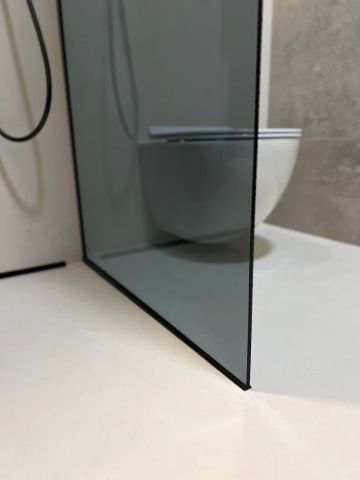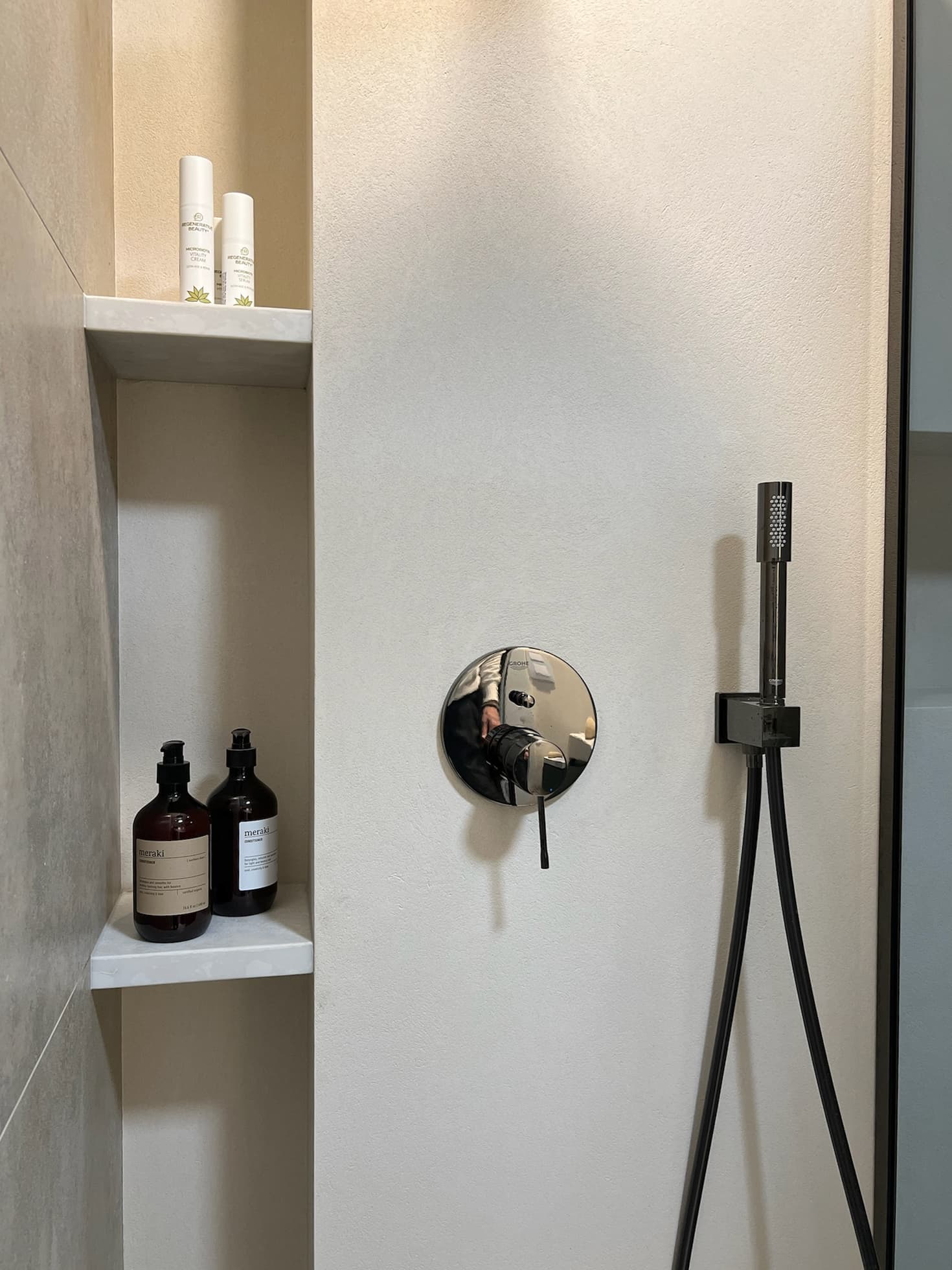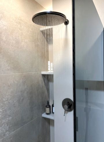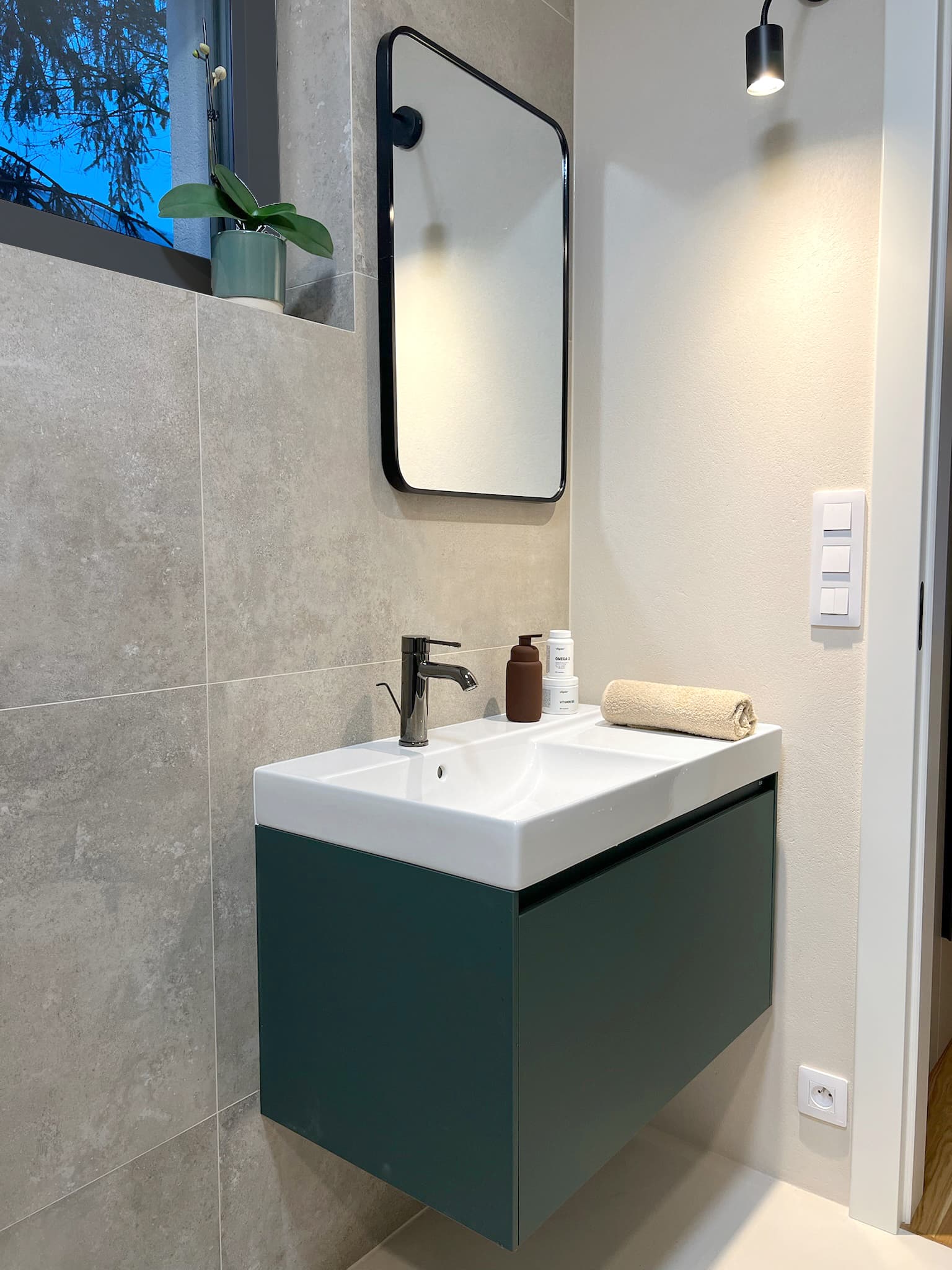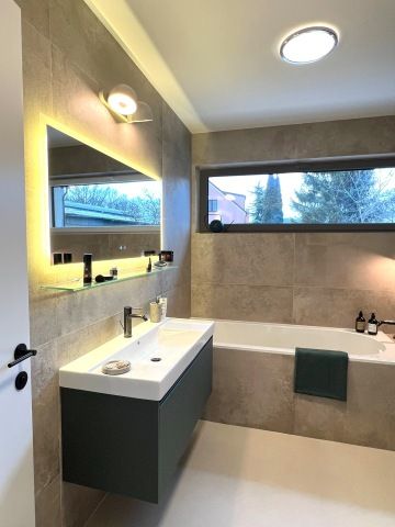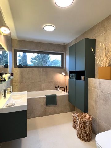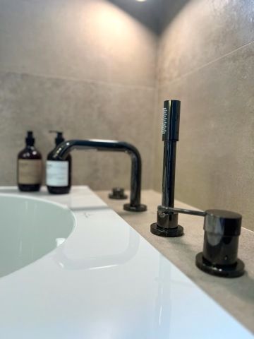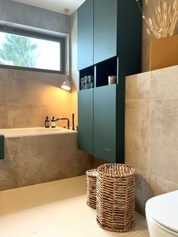 Paní domu si přála kuchyňskou linku ve tvaru „L“ s vestavnými spotřebiči a bez úchytek. Vybraly jsme lakovanou kuchyň s dohmatovými lištami, které jsou spolu se soklem lakované stejnou barvou jako dvířka. Jen díky tomu, že lišty a sokly jsou utopené hlouběji, působí tmavší díky stínu. Na pracovní desku jsme zvolily Technistone . Baterie je od Grohe ve stejné barvě a povrchové úpravě jako jsou baterie v koupelnách a podstavný dřez Villeroy & Boch.