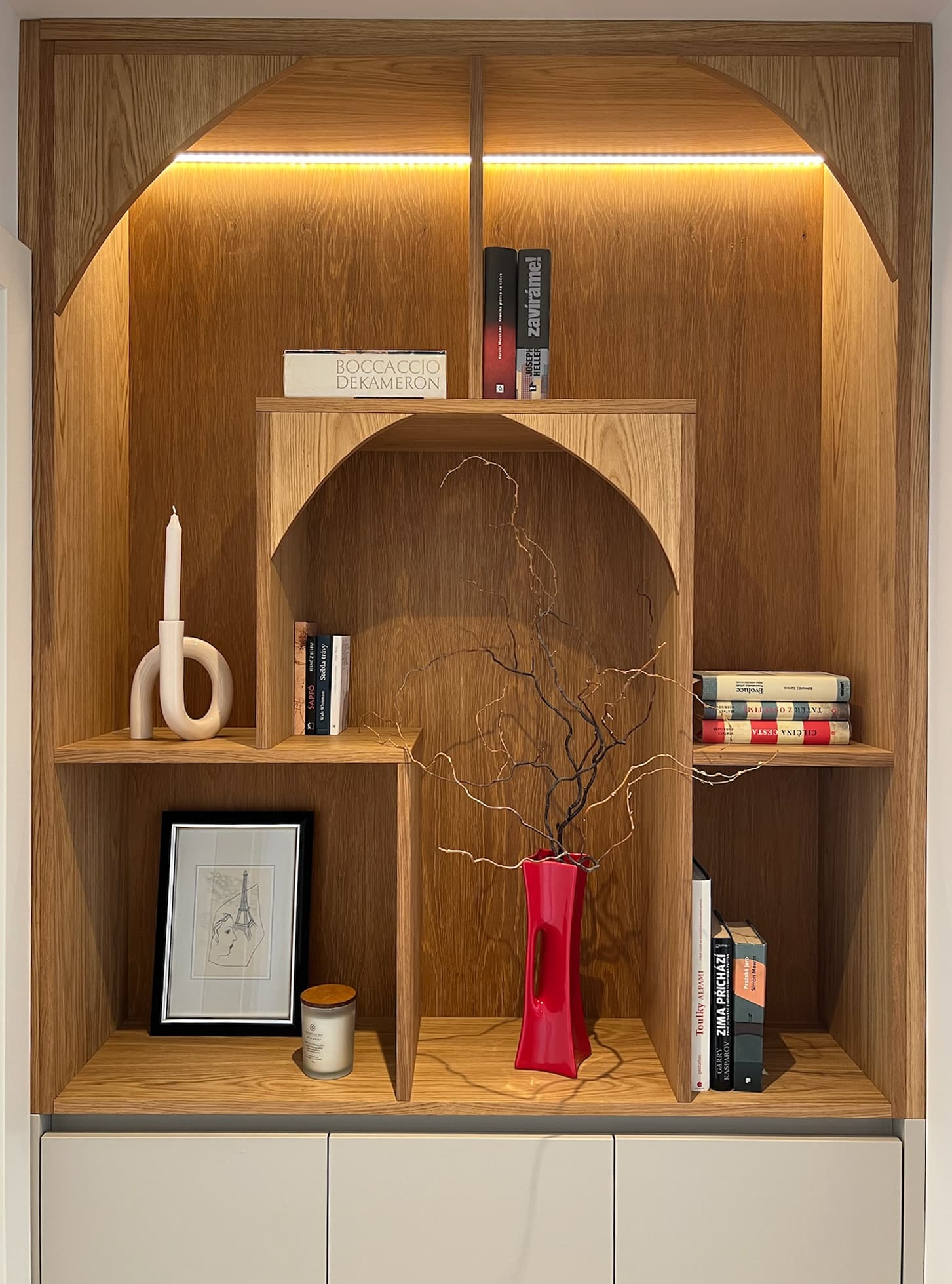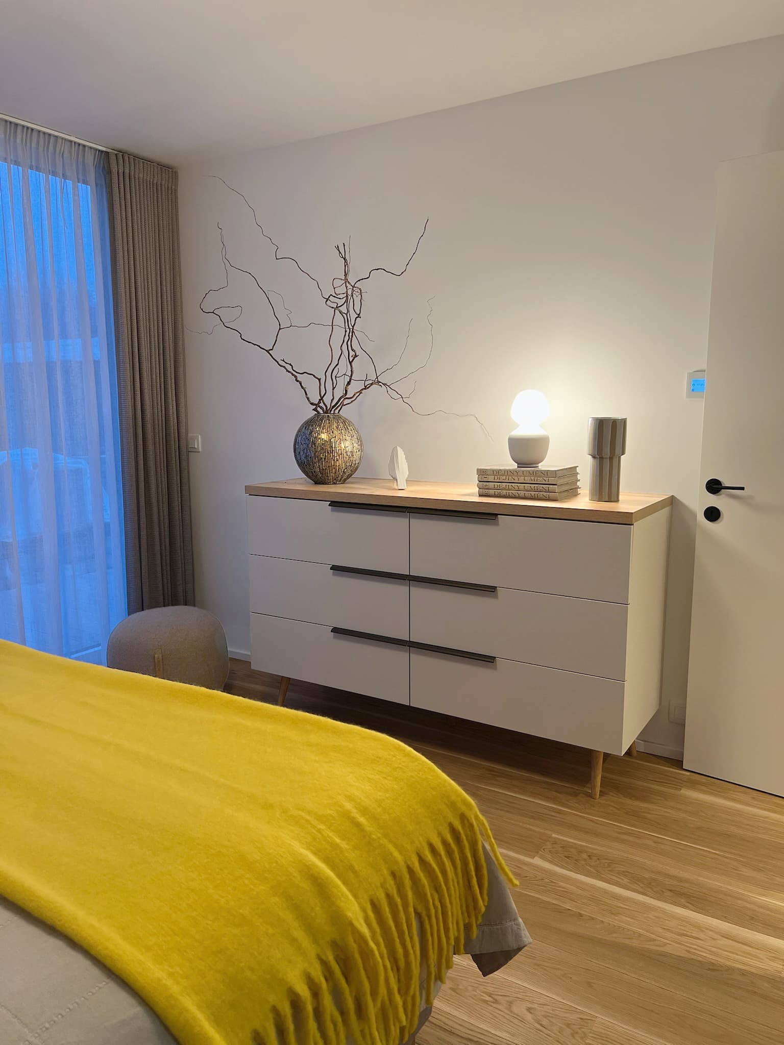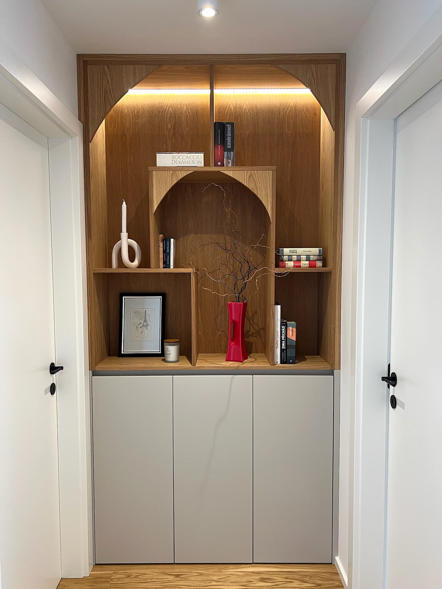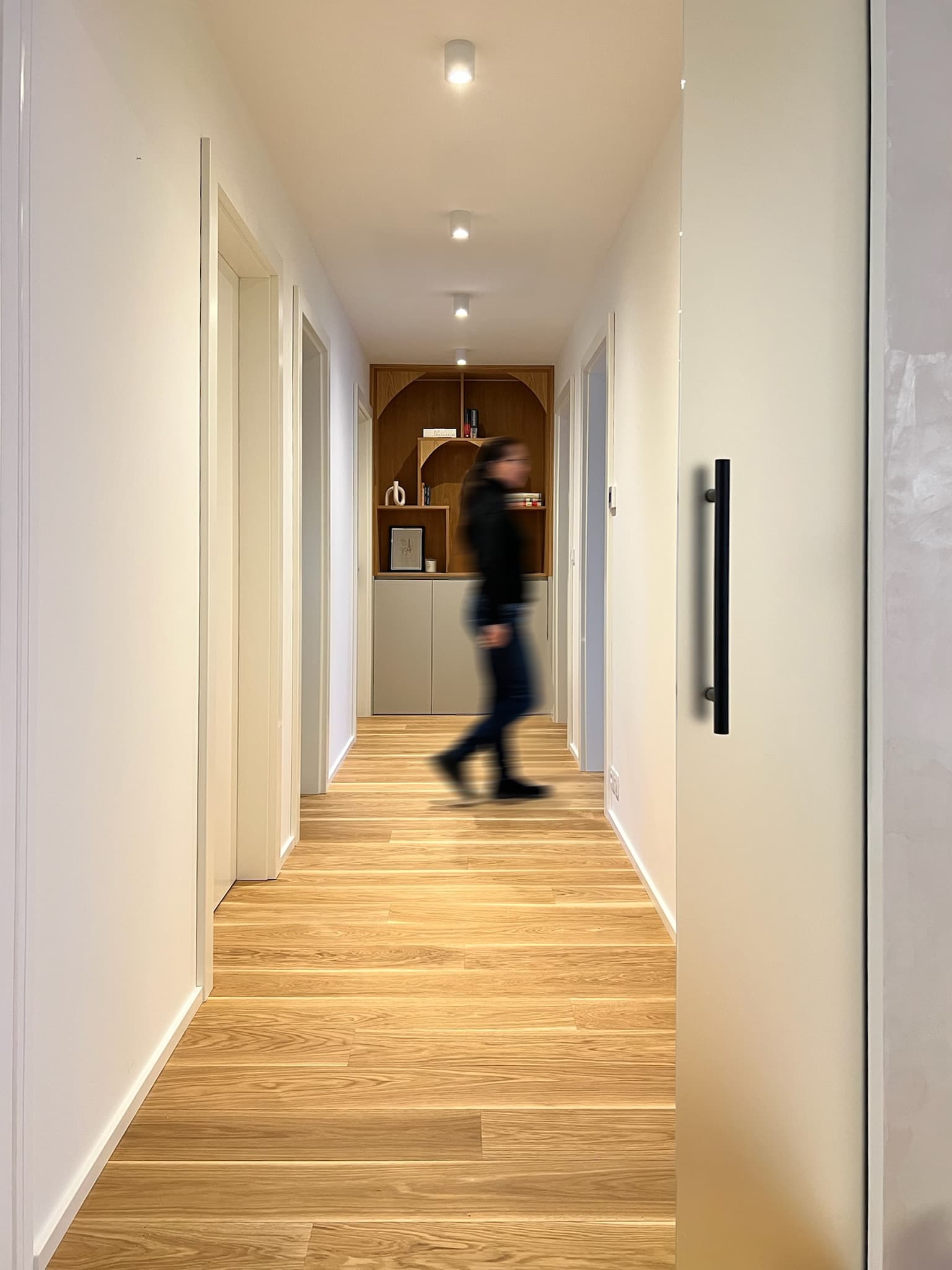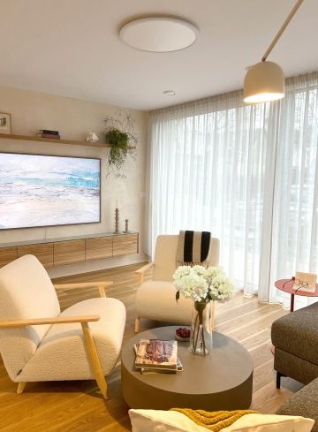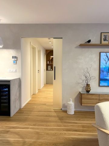 Klienti si přáli světlý vzdušný prostor kde nechybí přírodní materiály, truhlářské prvky na míru a osobité designové solitéry. Navrhly a realizovaly jsme celý prostor – od kuchyně přes koupelny až po výběr podlah a dveří, které ladí s celkovým konceptem. Rozpočet na zařízení se pohyboval kolem 2,5 mil. Kč.