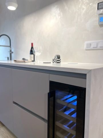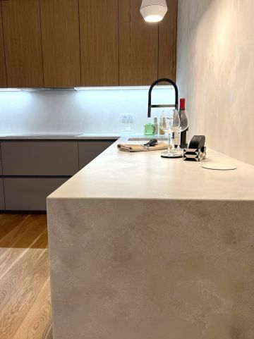 Pracovní deska z materiálu Technistone v betonovém dekoru přidává industriální šarm, zatímco speciální otěratelný nátěr mezi pracovní deskou a skříňkami zajišťuje praktičnost při zachování minimalistické estetiky.