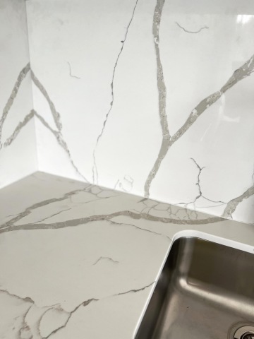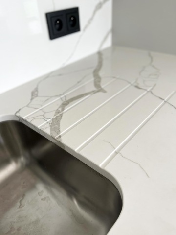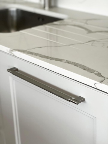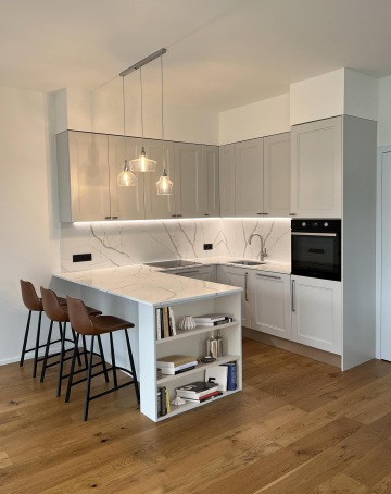 Kuchyně s rámečkovým dekorem na panelech dvířek je od našeho italského dodavatele Homecucine. Pracovní deska je Technistone — Calacatta. Ze zbytku desky jsme nechaly udělat konferenční stolky. Úchytky jsme vybraly od naší španělské srdcovky Viefe.