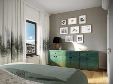 Byt 2+kk si od nás majitelé nechali navrhnout a zrealizovat pro jejich občasné, krátkodobější pobyty v Praze. V obývací místnosti se nachází i jídelní část a otevřená kuchyně ze které je navíc výhled skrz zastřešenou terasu na Prahu. Požadavkem klientů byla rozkládací pohovka pro návštěvy, jídelní stůl pro více osob a barové posezení v kuchyni, to vše proložit jejich sbírkou obrazů. Majitelé mají rádi dřevo a “opravdové” materiály jako jsou kámen, kov, sklo.
