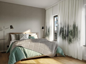 Prvním kusem nábytku do ložnice byla masivní postel z Donate, kterou si klienti sami vybrali. Téma poté určila látka kolekce Villa Nova od ROMO, která nás naprosto uchvátila — jedná se o látkové panely navržené dle maleb na keramiku od známé umělkyně Kyry cane. Velká orientální lakovaná komoda z masivního dřeva o šířce 2,6 m je z obchodu Gert Snel, stejně tak i stolní lampa s mosaznou bází. Pro vytvoření útulnější atmosféry je na 3 zdech šedá tapeta se jemnou látkovou strukturou.