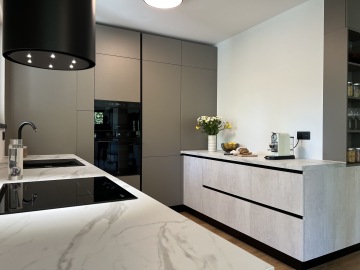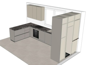 Pokud je v projektu kuchyně, nyní je chvíle kdy vybereme konkrétní model a začnou se rozpracovávat jednotlivé moduly, kde má být skříňka, kde jsou šuplata, vnitřní vybavení skříněk atd. konkrétní barevnost, materiály, dřez, doplňky a všechny spotřebiče.