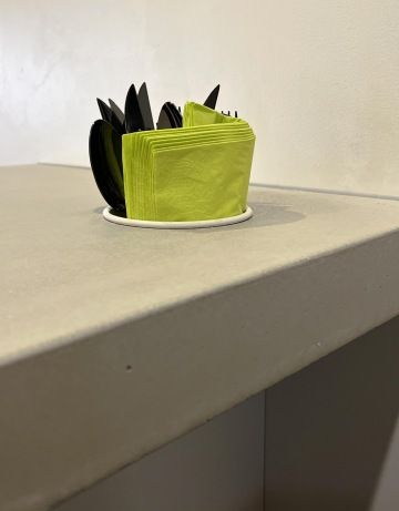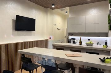 V zadání také byl požadavek, aby se do skyboxu vešlo cca 15 lidí, aby bylo dostatek prostoru na stolech na občerstvení a hodně úložného prostoru v kuchyňských skříňkách. Použité materiály měly být odolné a i zdi otěratelné. Také jsme měly myslet na děti, kdyby někdy doprovázely rodiče, aby se měly čím zabavit, a tak vznikl u vchodu malý herní prostor.