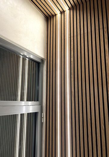 Pro útulnost a lepší akustiku v prostoru jsme na strop a část stěny navrhly akustické dýhované panely od českého výrobce Woodpasta. Svítidla jsou minimalistická opět v černé barvě se zónovým vypínaním po párech, aby bylo možno vytvořit libovolnou světelnou atmosféru. Čistě náladovým osvícením jsou LED pásky vedoucí přes strop a boční stěnu až k podlaze skyboxu.