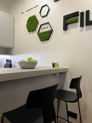 Požadavky na vzhled ze strany společnosti Filipa zněly: čistý, světlý vzhled, lehký ne příliš robustní nábytek, útulný dojem a použití kvalitních a "opravdových" materiálů. Pro klienta jsme tedy navrhly koncept sestávající z materiálů beton, dub, černý kov s ústředními barvami bílou, světle šedou a firemní zelenou, kterou jsme v konceptu zdůraznily použitím stabilizovaného mechu. Na všech stěnách je bílá dekorativní stěrka Ottocento s perleťovými odlesky, která je odolná a lehce otěratelná.