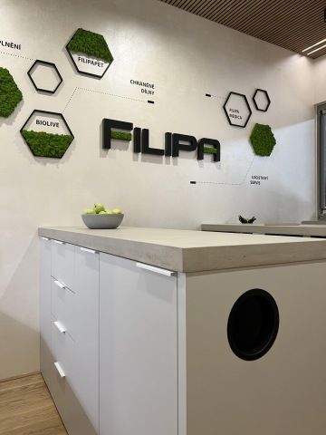 Pro vizuální prezentaci firmy a dekoraci nám zbyla jediná stěna nad betonovými pulty. Chtěly jsme, aby byla nejen dekorativní a zajímavá svými materiály, ale aby také ve zkratce představila společnost Filipa a.s. a její činnosti. Dekorace je pro dodání reliéfu vytvořena ve 3 výškách a ze 3 různých materiálů. Pod touto stěnou jsou také skryté výztuže pro pulty — každý pult váží cca 120 kg, jejich dokonalé kotvení do zdí a podlahy bylo tedy zásadní.