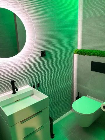Kvůli nedostatku prostoru nebylo možné splachovací moduly WC a pisoáru zasekat do stěny, bylo nutné vytvořit přizdívku, kterou jsme, ale pak mohly využít k umístění další přírodní mechové dekorace a dodání dalšího zeleného prvku do prostor společné toalety.